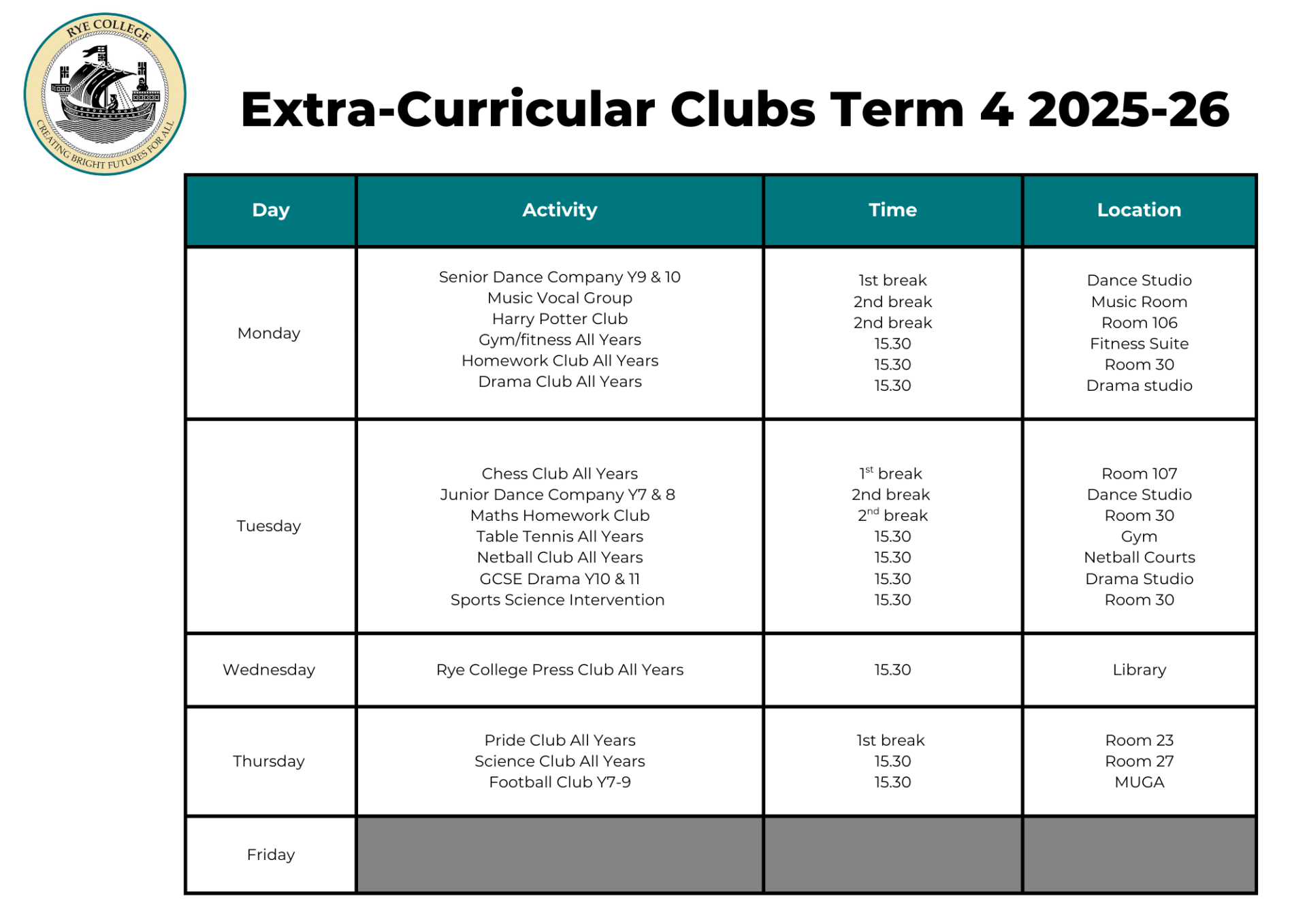 Extra Curricular Clubs Timetable Term 4 2025/26